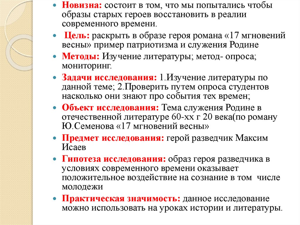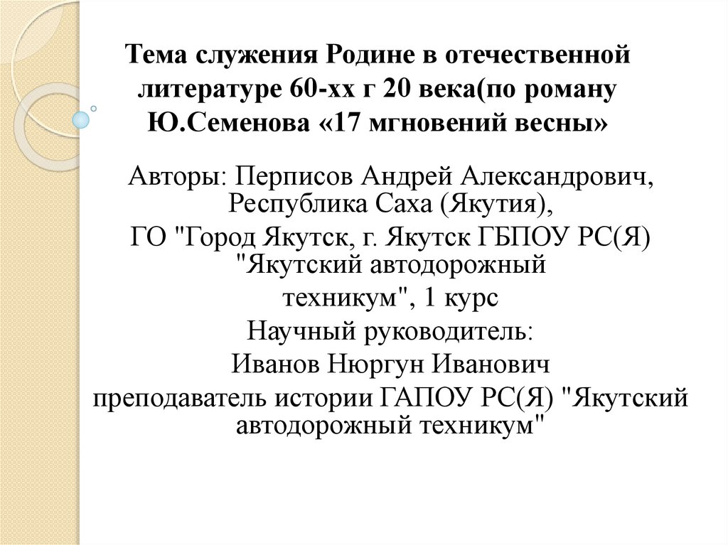 Тема служения Родине в отечественной литературе 60-хх г 20 века(по роману Ю.Семенова «17 мгновений весны»)