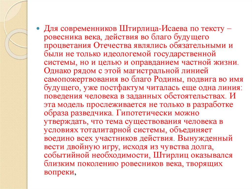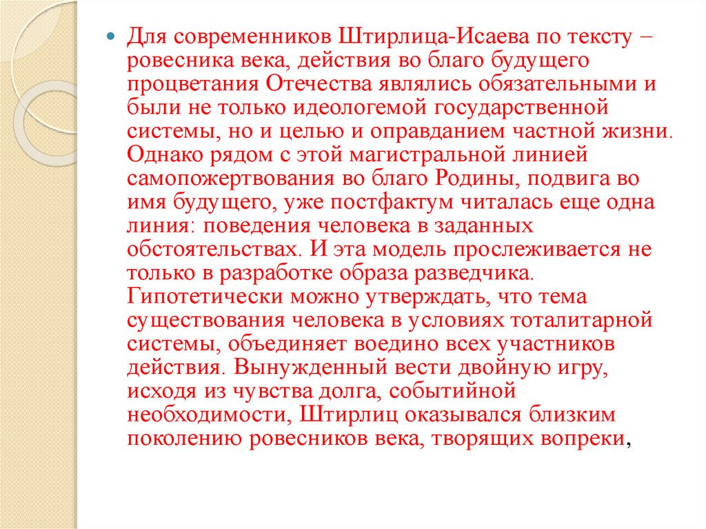 Для современников Штирлица-Исаева по тексту –ровесника века, действия во благо будущего