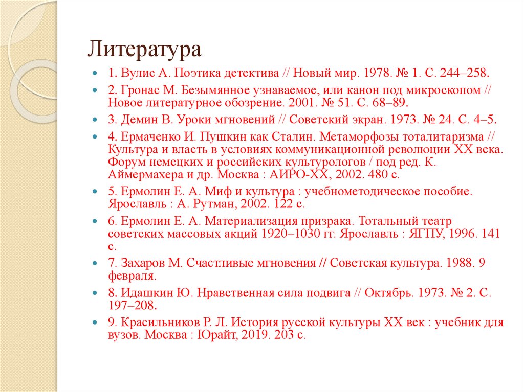 Литература1. Вулис А. Поэтика детектива // Новый мир. 1978. № 1. С. 244–258.
