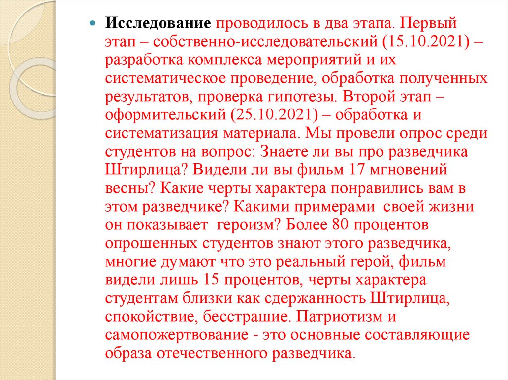 Исследование проводилось в два этапа. Первыйэтап – собственно-исследовательский (15.10.2021) –