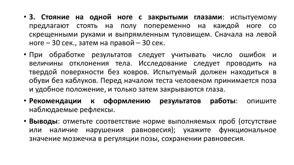 • 3. Стояние на одной ноге с закрытыми глазами: испытуемомупредлагают стоять на полу попеременно на каждой ноге со