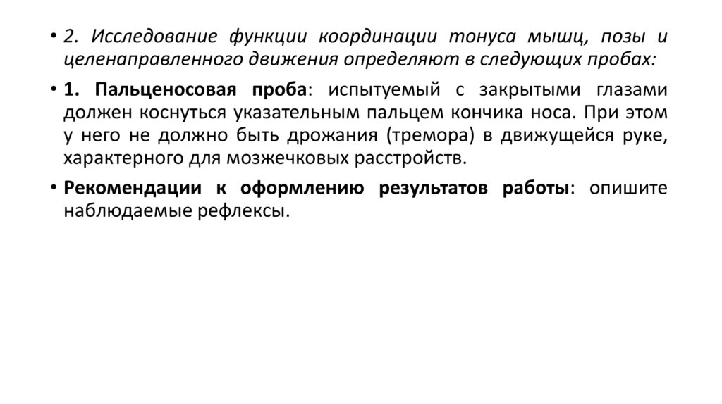 • 2. Исследование функции координации тонуса мышц, позы ицеленаправленного движения определяют в следующих пробах: