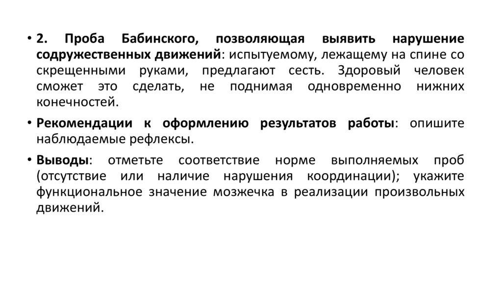 • 2. Проба Бабинского, позволяющая выявить нарушениесодружественных движений: испытуемому, лежащему на спине со