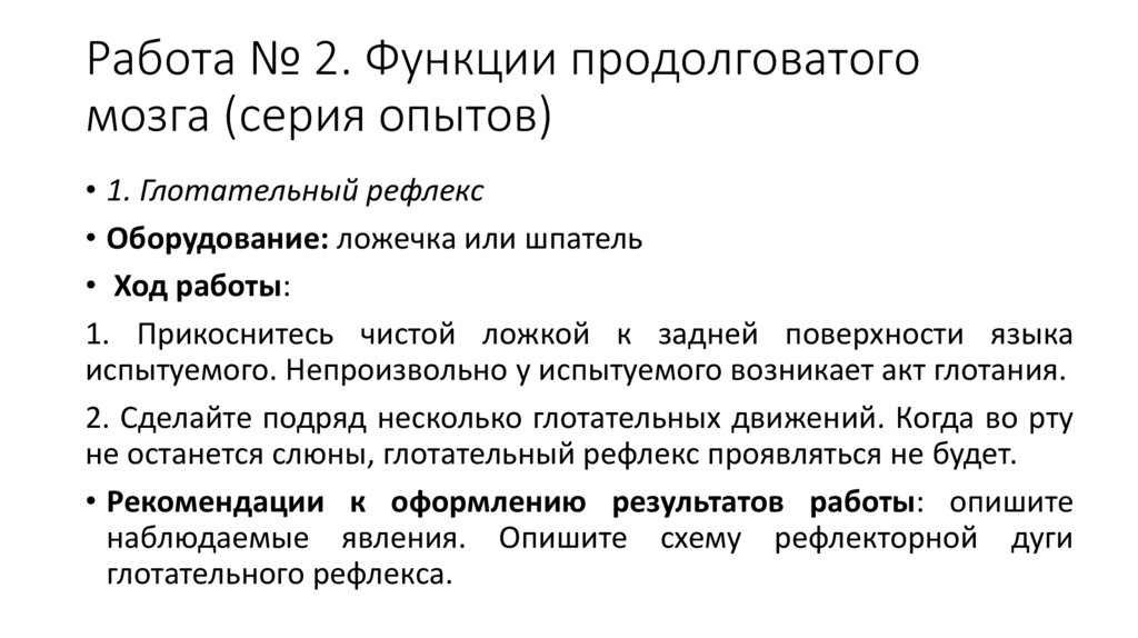 Работа № 2. Функции продолговатогомозга (серия опытов)