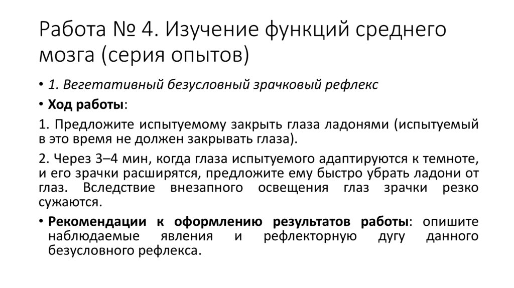 Работа № 4. Изучение функций среднегомозга (серия опытов)