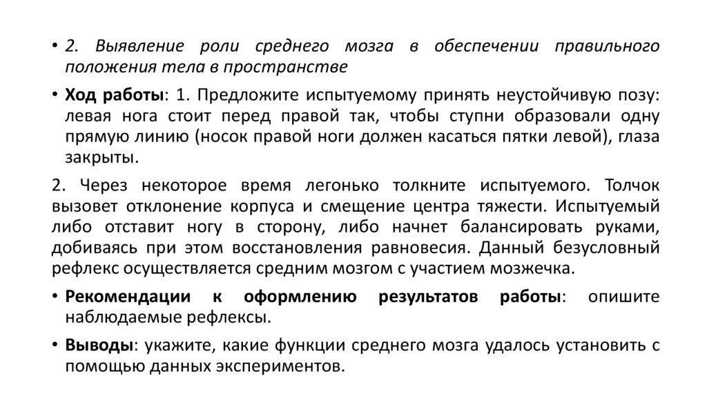 • Выводы: укажите, какие функции среднего мозга удалось