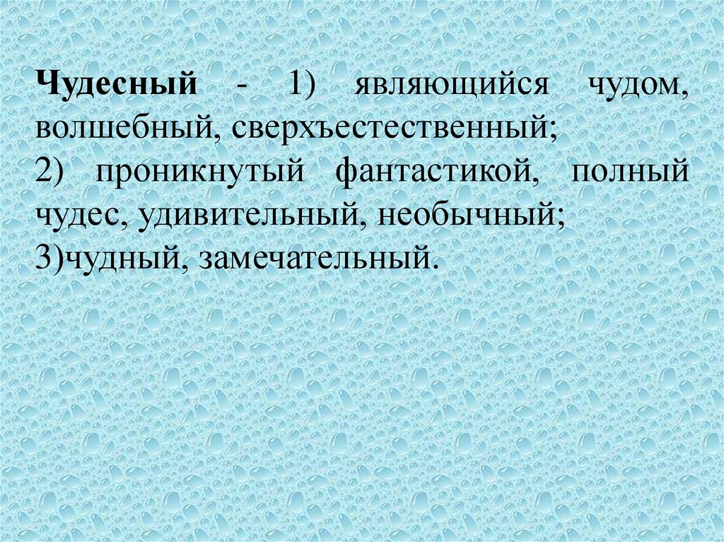 Чудесный - 1) являющийся чудом,волшебный, сверхъестественный;