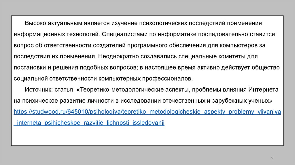 Высоко актуальным является изучение психологических последствий примененияинформационных технологий. Специалистами по информатике последовательно ставится