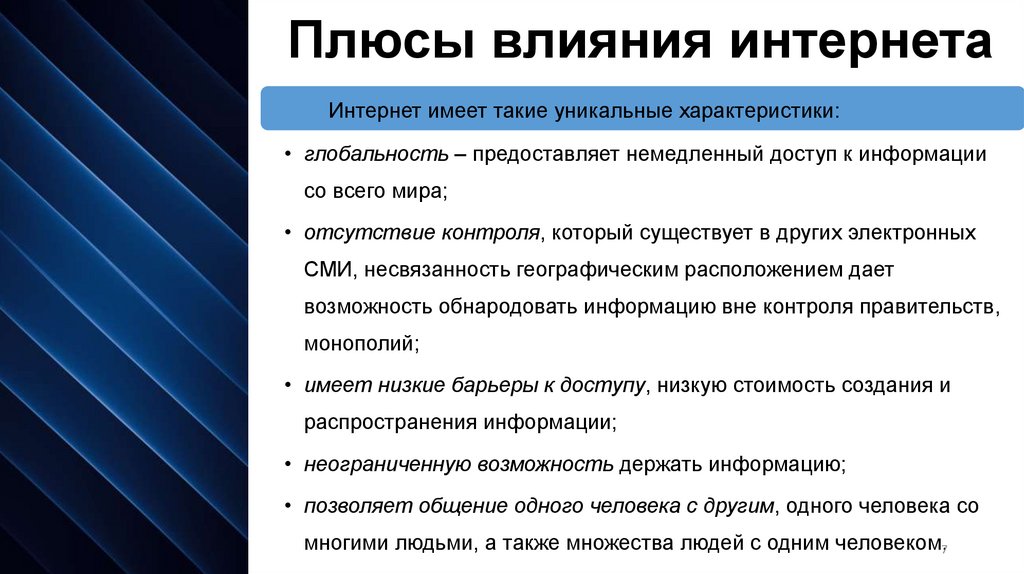 Плюсы влияния интернетаИнтернет имеет такие уникальные характеристики: