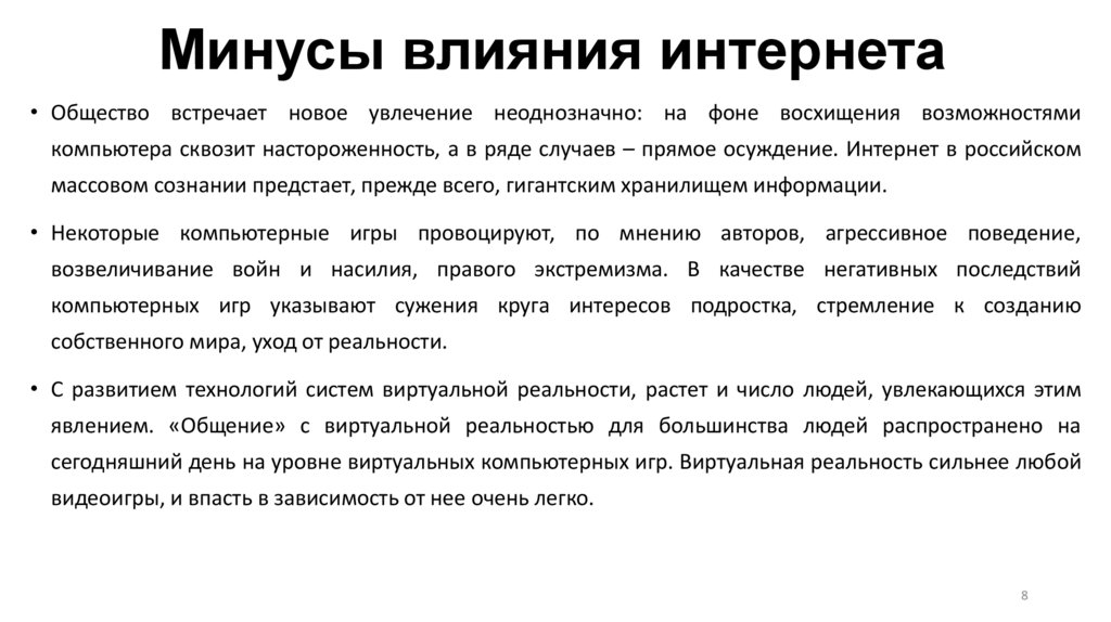 Минусы влияния интернета• Общество встречает новое увлечение неоднозначно: на фоне восхищения возможностями