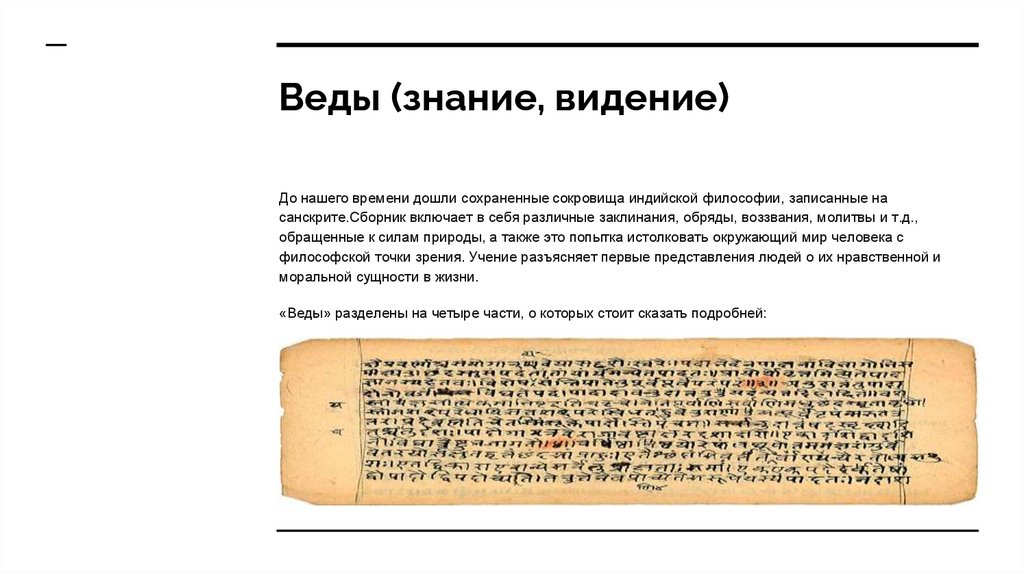 Веды (знание, видение)До нашего времени дошли сохраненные сокровища индийской философии, записанные на