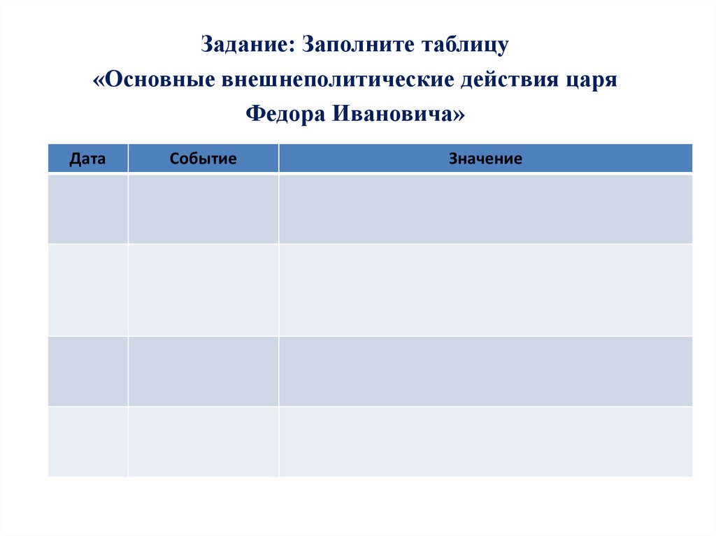 Задание: Заполните таблицу«Основные внешнеполитические действия царя