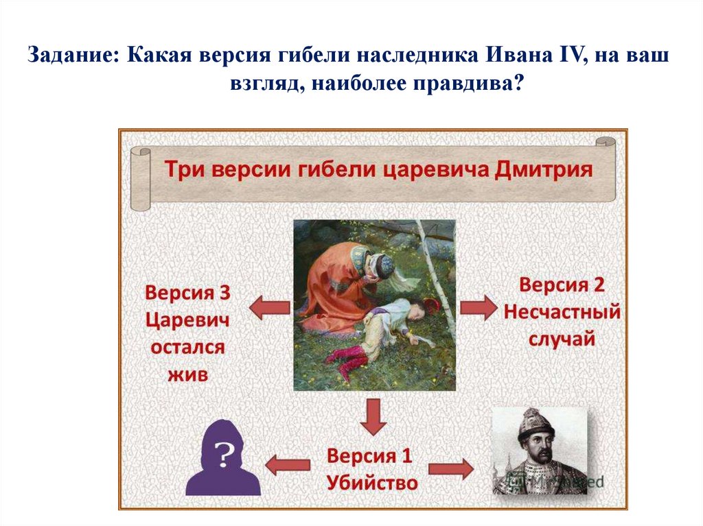 Задание: Какая версия гибели наследника Ивана IV, на вашвзгляд, наиболее правдива?