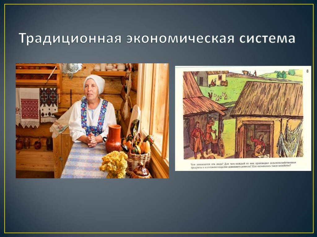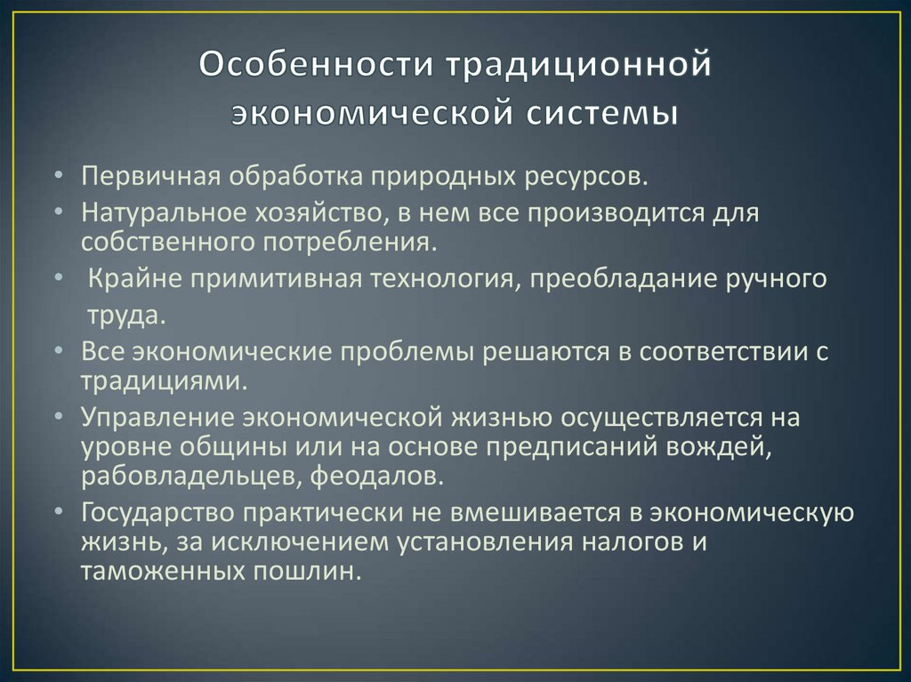 • Первичная обработка природных ресурсов.• Натуральное хозяйство, в нем все производится для