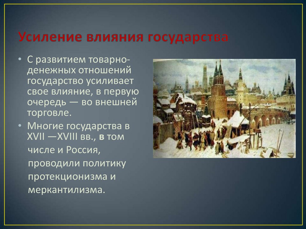 • С развитием товарноденежных отношенийгосударство усиливает
