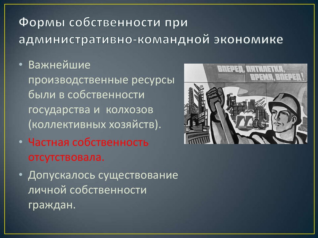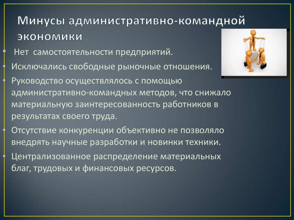 • Нет самостоятельности предприятий.• Исключались свободные рыночные отношения.