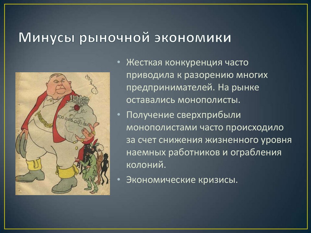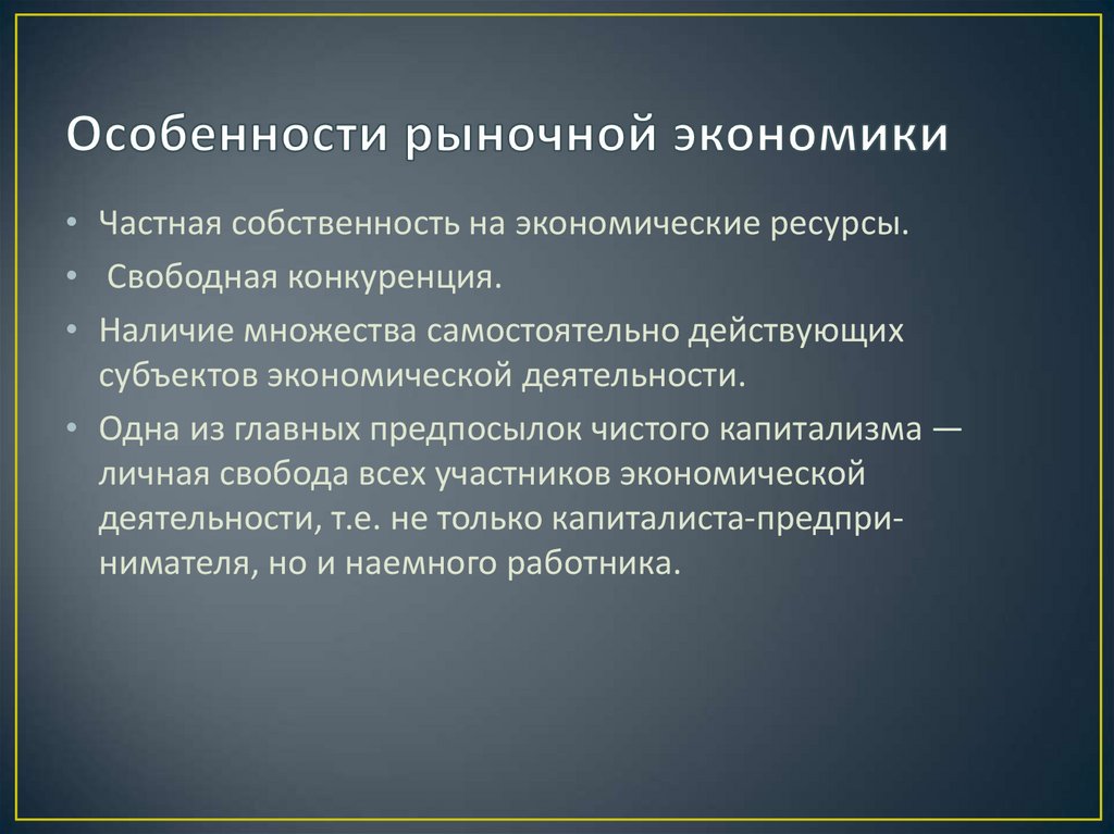• Частная собственность на экономические ресурсы.• Свободная конкуренция.