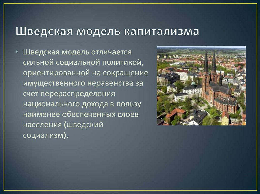 • Шведская модель отличаетсясильной социальной политикой,