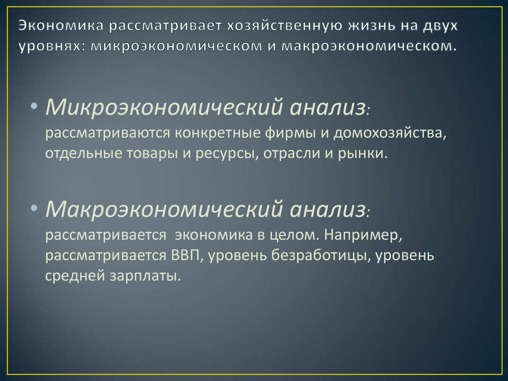 • Микроэкономический анализ:рассматриваются конкретные фирмы и домохозяйства,