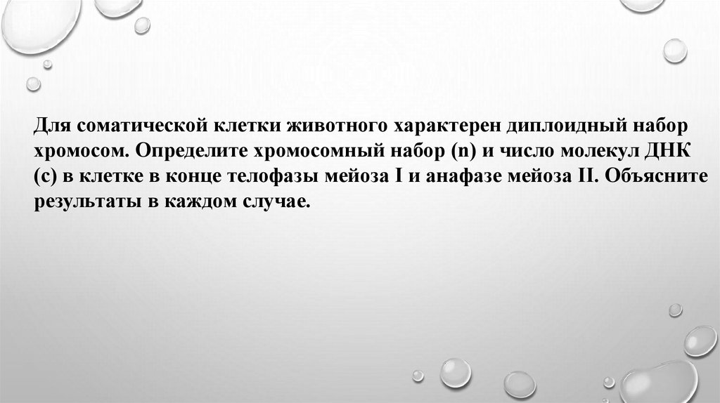 Для соматической клетки животного характерен диплоидный наборхромосом. Определите хромосомный набор (n) и число молекул ДНК