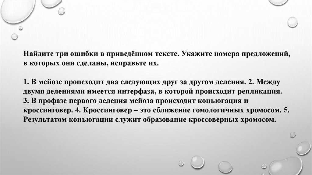 1. В мейозе происходит два следующих друг за другом деления. 2. Между