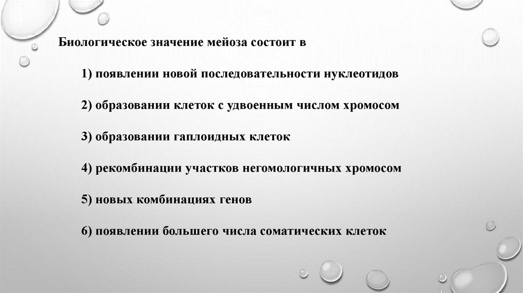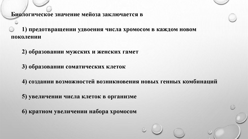 Биологическое значение мейоза заключается в1) предотвращении удвоения числа хромосом в каждом новом