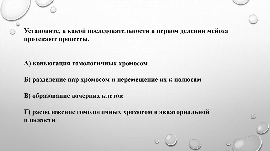 Установите, в какой последовательности в первом делении мейозапротекают процессы.