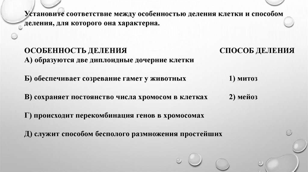 Установите соответствие между характеристикой процесса и способом деления клетки,который она иллюстрирует.