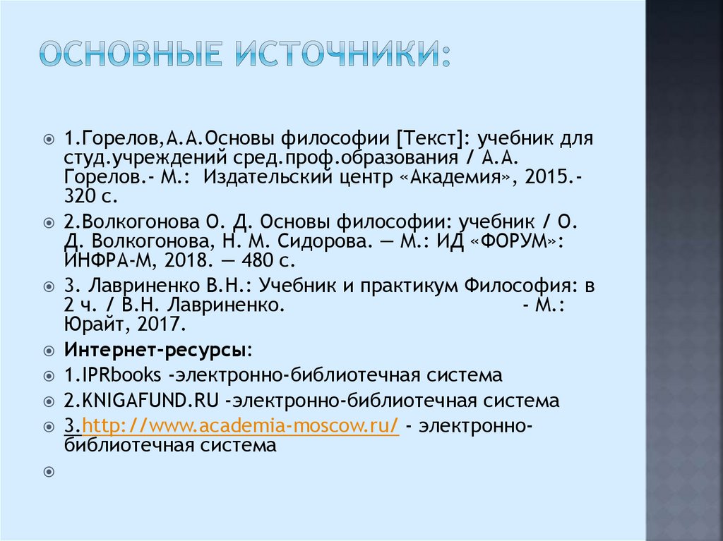 1.Горелов,А.А.Основы философии [Текст]: учебник длястуд.учреждений сред.проф.образования / А.А.