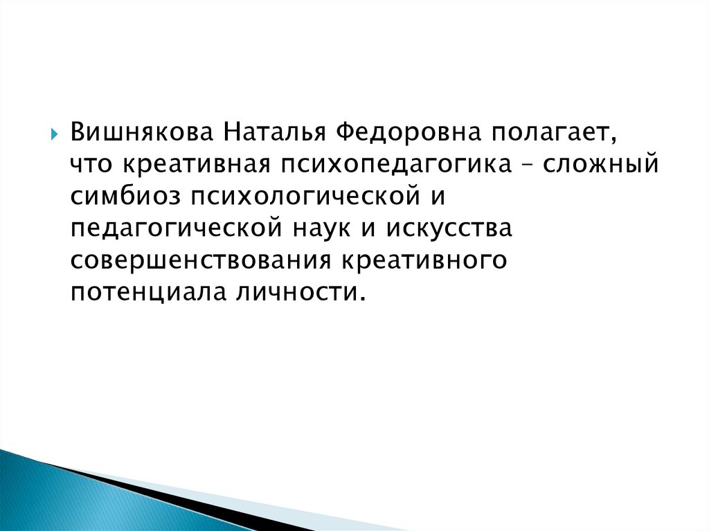 Вишнякова Наталья Федоровна полагает,что креативная психопедагогика – сложный