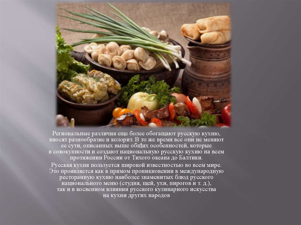 Региональные различия еще более обогащают русскую кухню,вносят разнообразие и колорит. В то же время все они не меняют