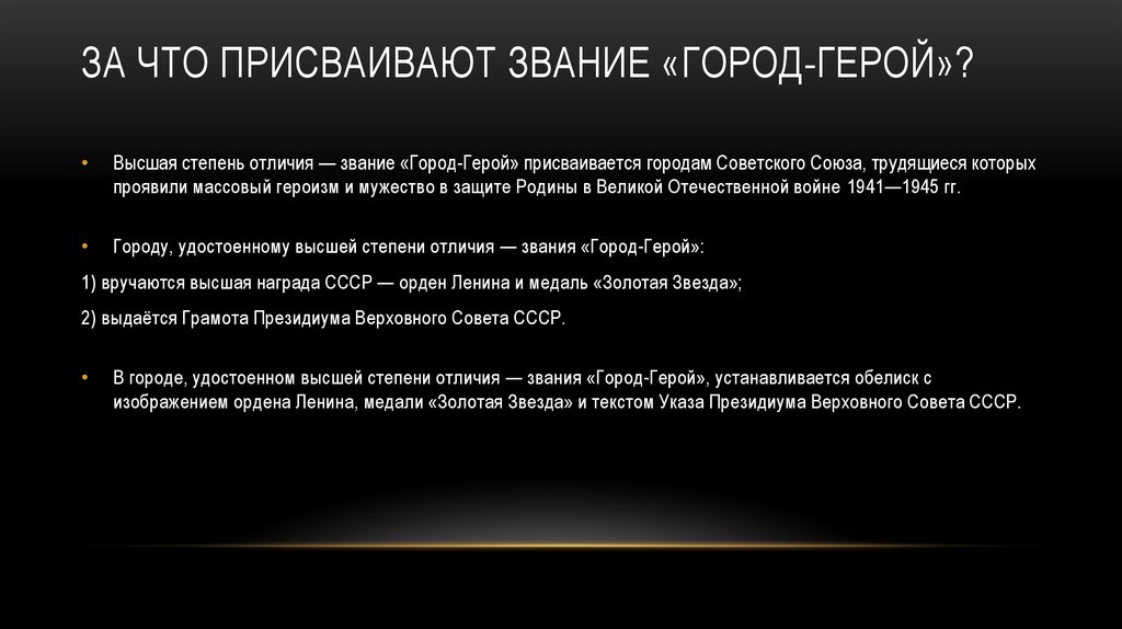 ЗА ЧТО ПРИСВАИВАЮТ ЗВАНИЕ «ГОРОД-ГЕРОЙ»?Высшая степень отличия — звание «Город-Герой» присваивается городам Советского Союза, трудящиеся которых