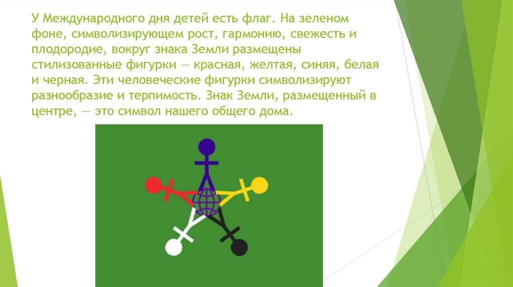 У Международного дня детей есть флаг. На зеленомфоне, символизирующем рост, гармонию, свежесть и