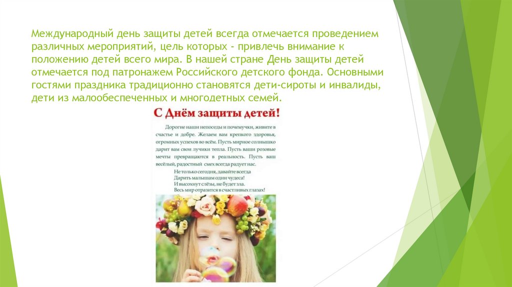 Международный день защиты детей всегда отмечается проведениемразличных мероприятий, цель которых - привлечь внимание к