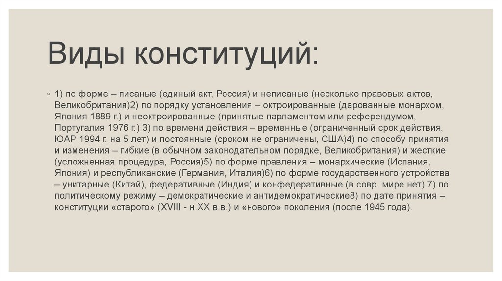 Виды конституций:◦ 1) по форме – писаные (единый акт, Россия) и неписаные (несколько правовых актов,