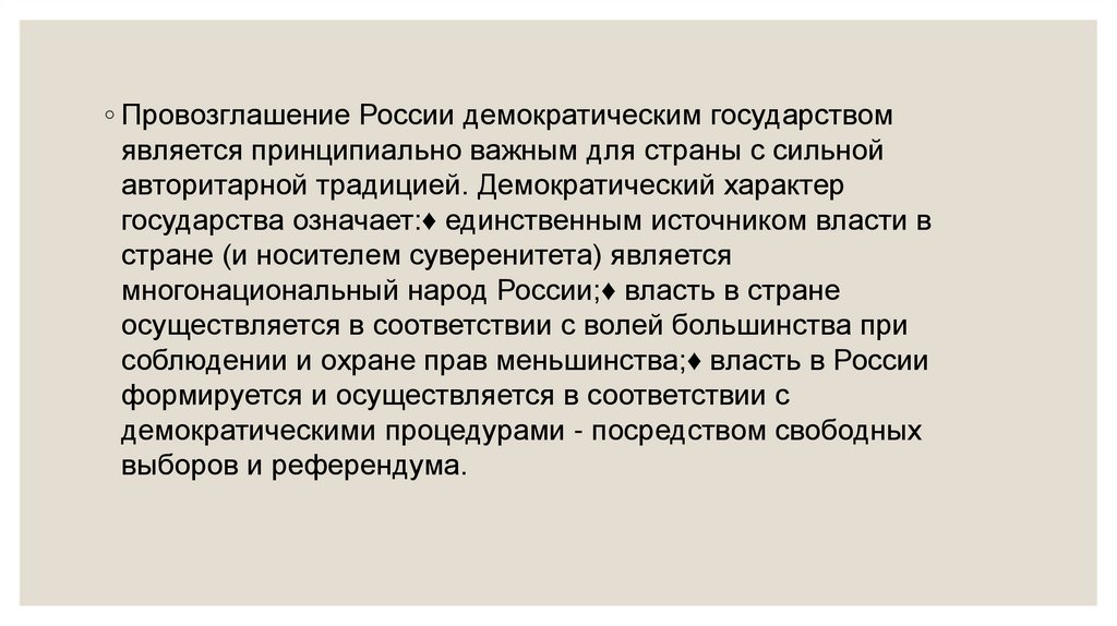 ◦ Провозглашение России демократическим государствомявляется принципиально важным для страны с сильной
