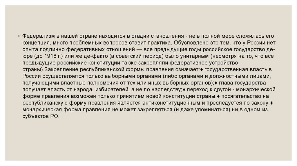 ◦ Федерализм в нашей стране находится в стадии становления - не в полной мере сложилась егоконцепция, много проблемных вопросов ставит практика. Обусловлено это тем, что у России нет