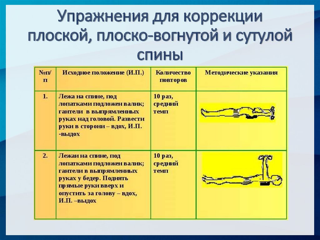 Упражнения для коррекцииплоской, плоско-вогнутой и сутулой