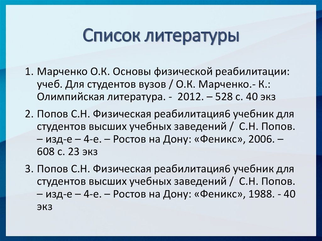 Список литературы1. Марченко О.К. Основы физической реабилитации: