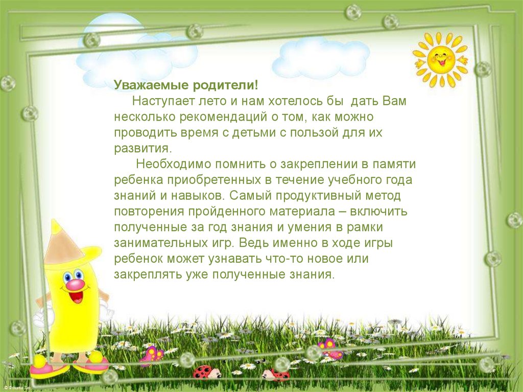 Уважаемые родители!Наступает лето и нам хотелось бы дать Вам