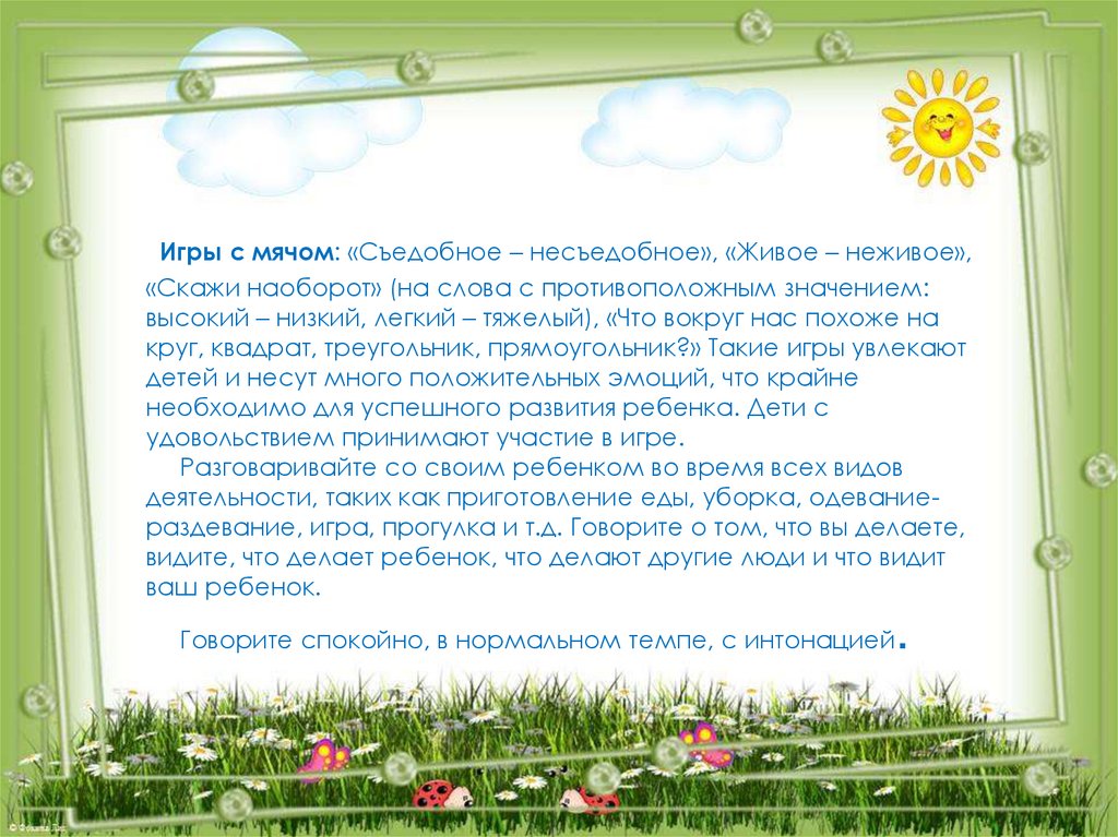 Игры с мячом: «Съедобное – несъедобное», «Живое – неживое»,«Скажи наоборот» (на слова с противоположным значением:
