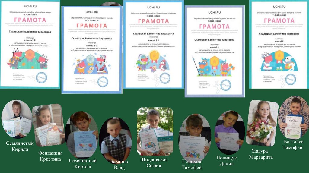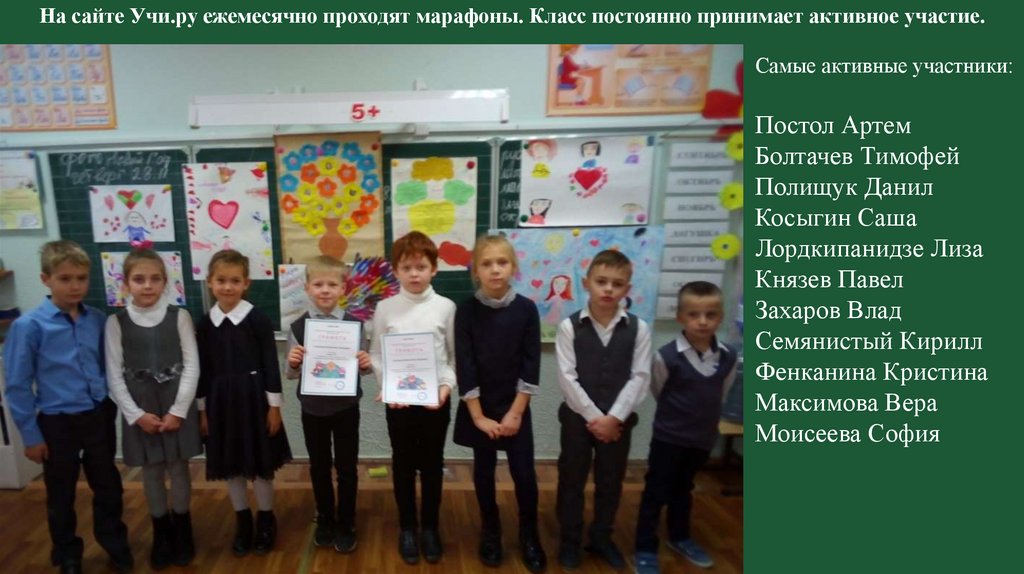 На сайте Учи.ру ежемесячно проходят марафоны. Класс постоянно принимает активное участие.Самые активные участники: