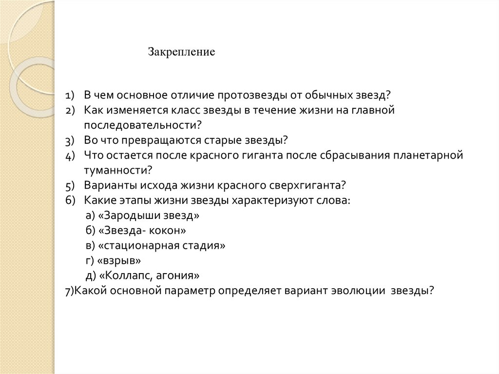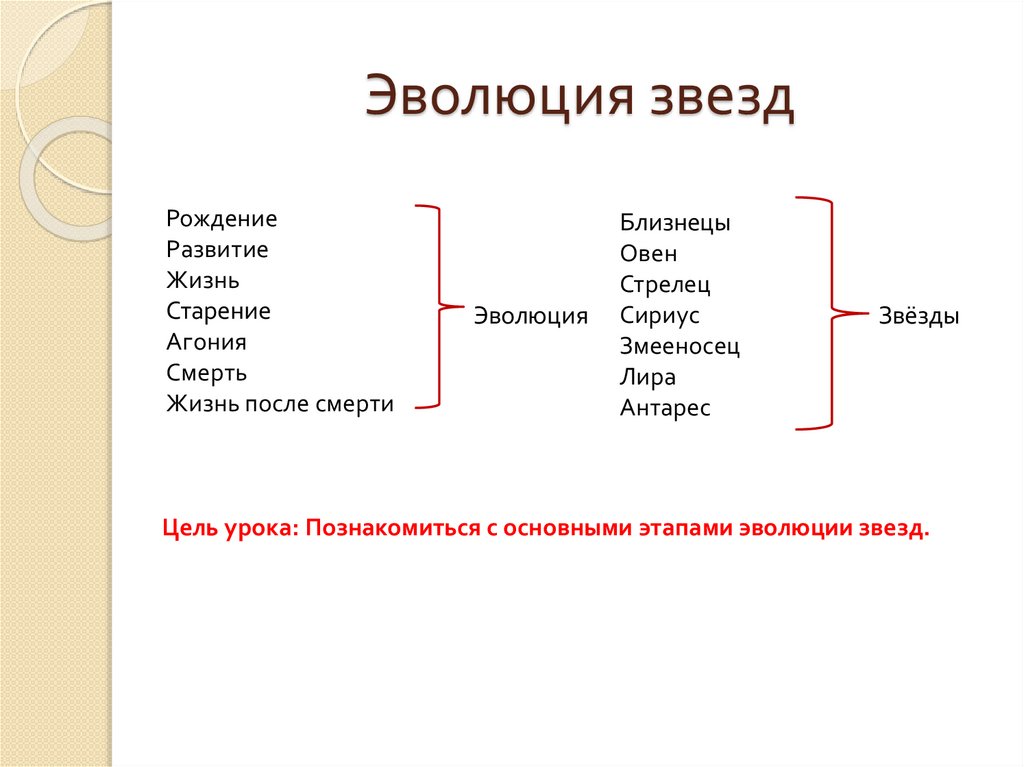 Цель урока: Познакомиться с основными этапами эволюции звезд.