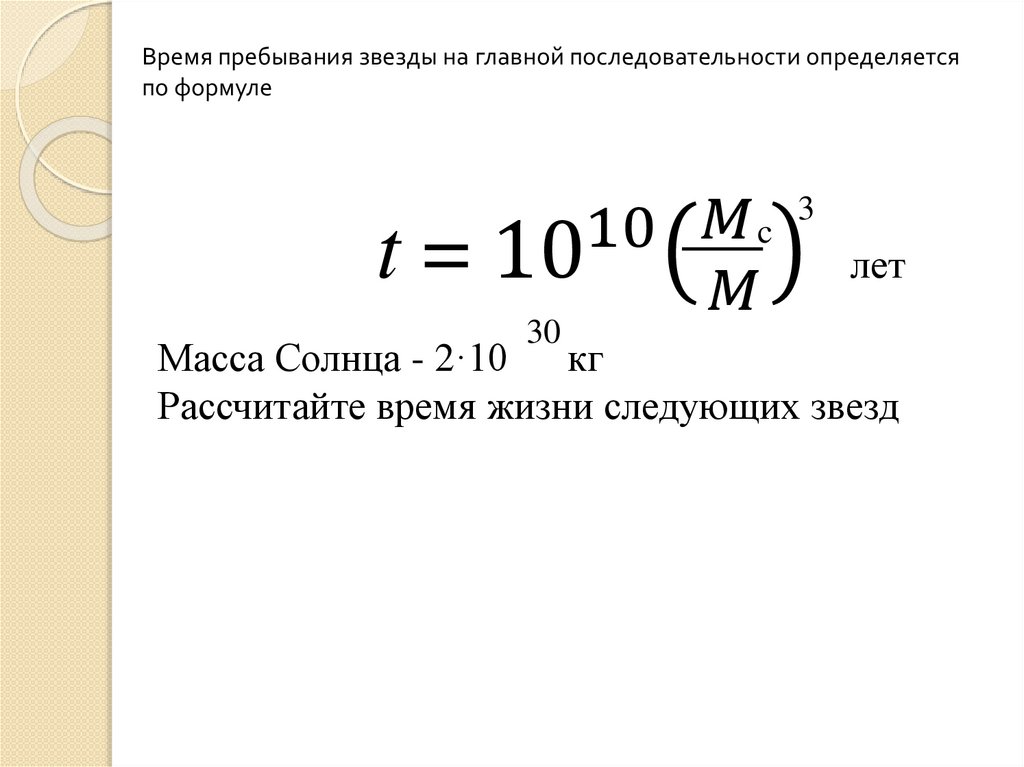 Время пребывания звезды на главной последовательности определяетсяпо формуле