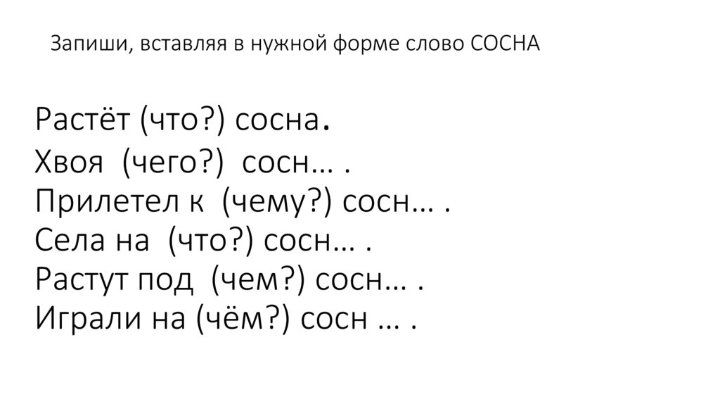 Запиши, вставляя в нужной форме слово СОСНАРастёт (что?) сосна.