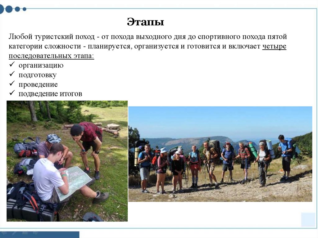 ЭтапыЛюбой туристский поход - от похода выходного дня до спортивного похода пятой