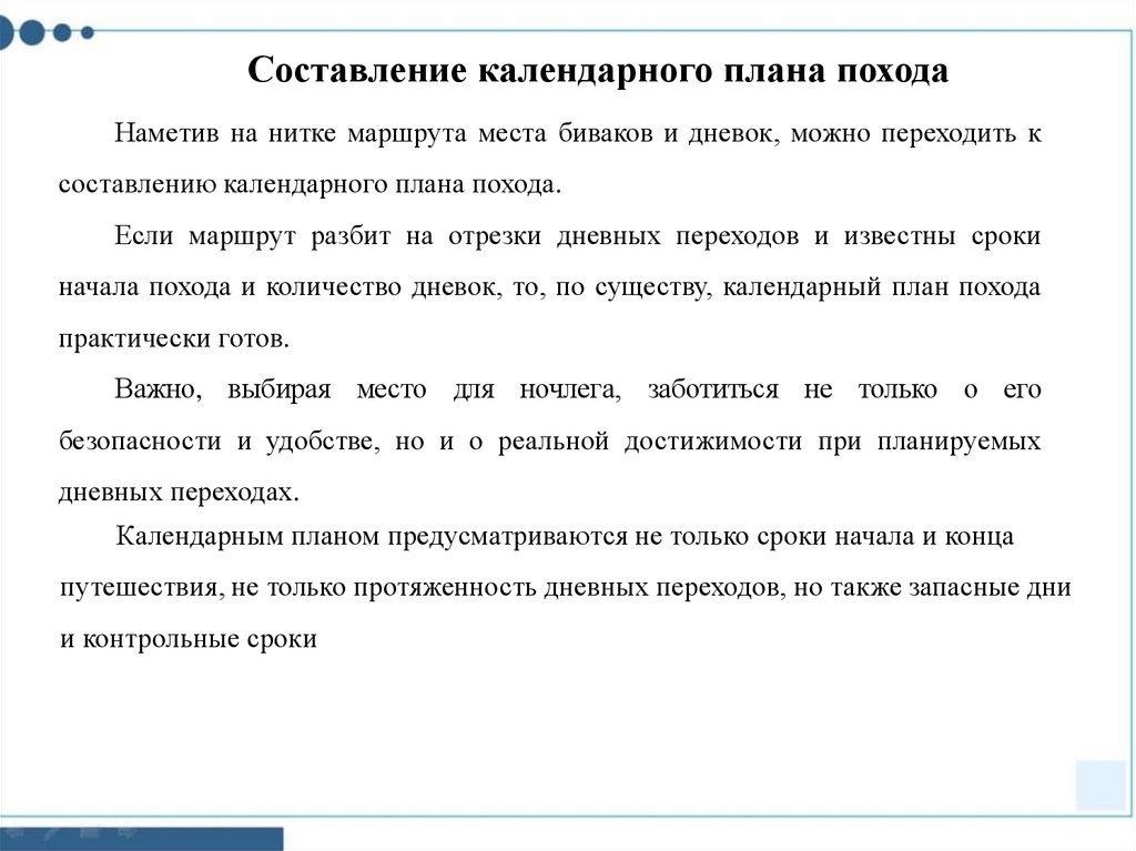 Составление календарного плана походаНаметив на нитке маршрута места биваков и дневок, можно переходить к
