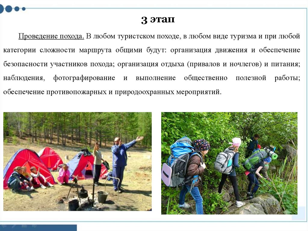 3 этапПроведение похода. В любом туристском походе, в любом виде туризма и при любой