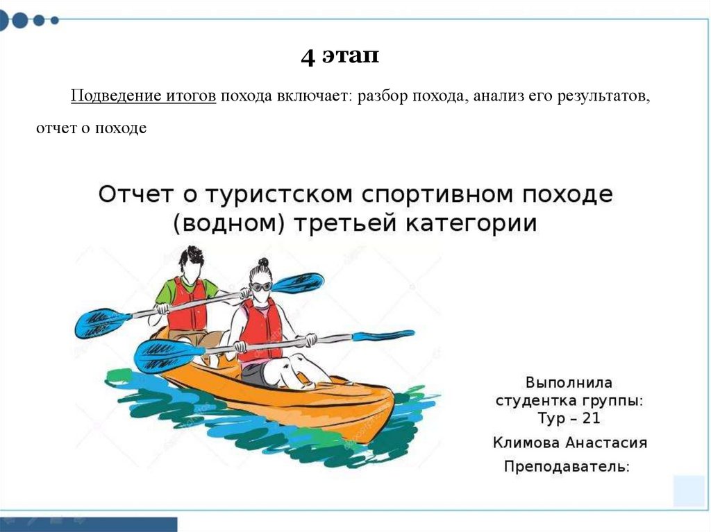 4 этапПодведение итогов похода включает: разбор похода, анализ его результатов,