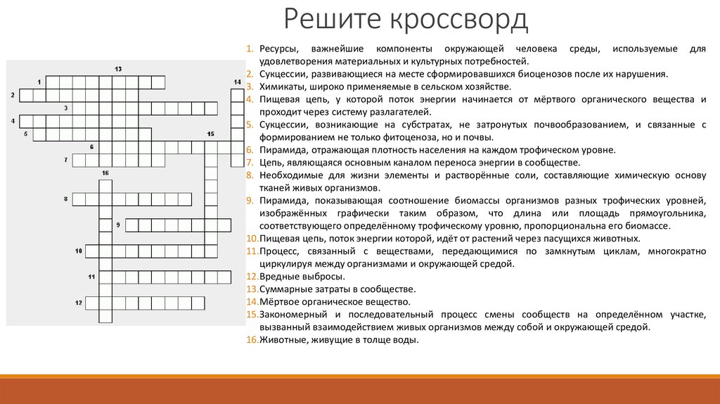 Решите кроссворд1. Ресурсы, важнейшие компоненты окружающей человека среды, используемые для